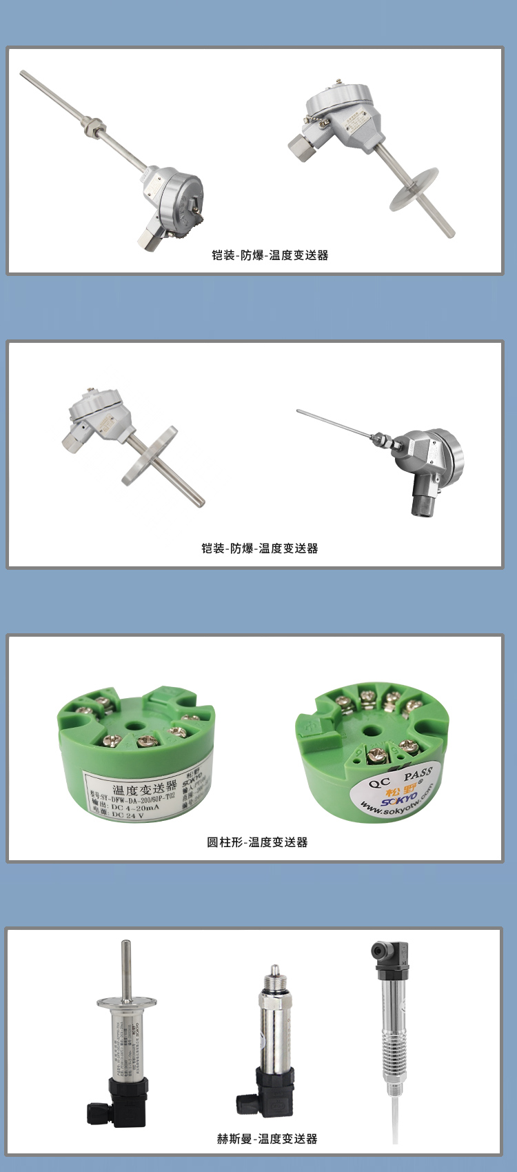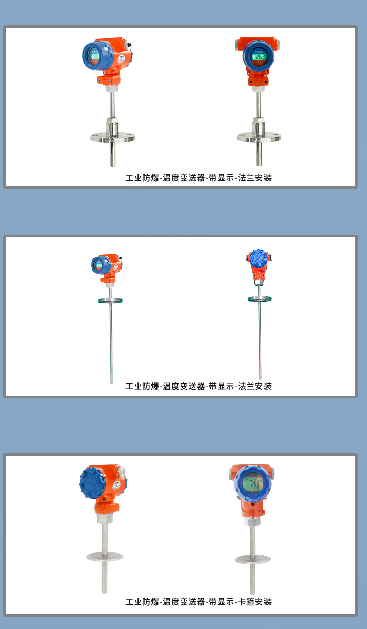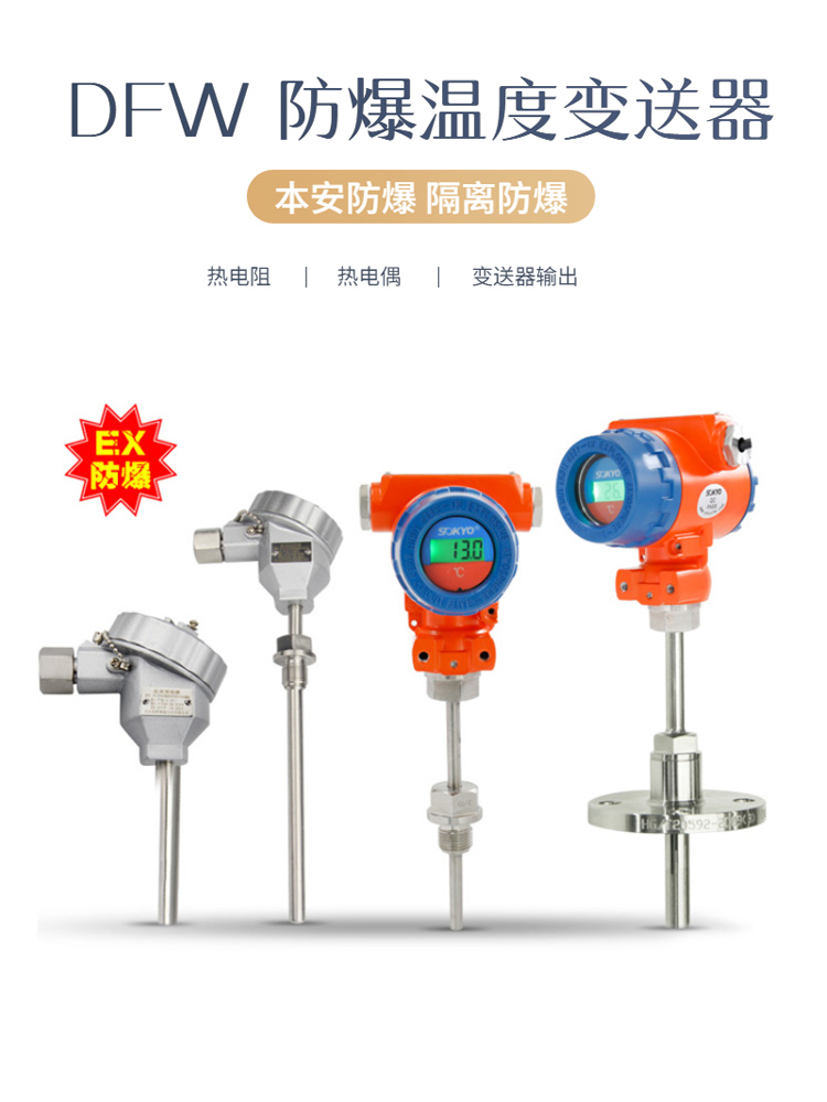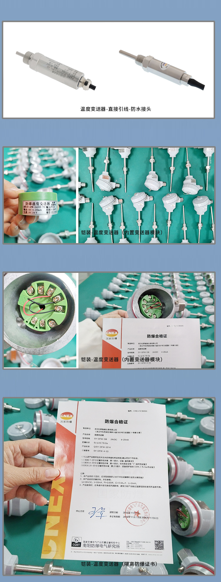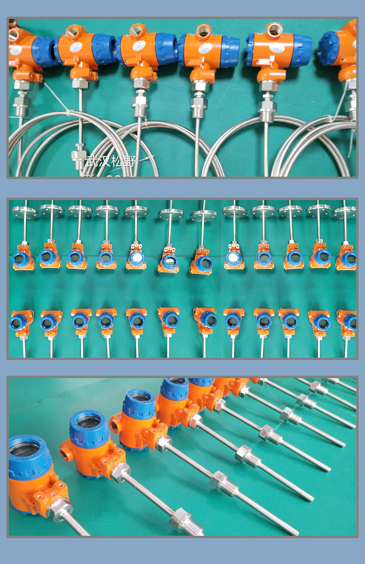 信號(hào)輸出 防爆型溫度變送器能夠輸出標(biāo)準(zhǔn)的DC4~20mA電流信號(hào),這一信號(hào)范圍廣泛適用于各種工業(yè)自動(dòng)化控制系統(tǒng),便于數(shù)據(jù)的采集、處理和遠(yuǎn)程監(jiān)控。 為了滿足不同工業(yè)場合的需求,防爆型溫度變送器防爆型溫度傳感器的外形結(jié)構(gòu)和安裝方式也多種多樣。 外形結(jié)構(gòu):包括圓柱型變送器模塊、鎧裝式一體化、工業(yè)型一體化或赫斯曼結(jié)構(gòu)等。這些結(jié)構(gòu)各具特點(diǎn),如圓柱型結(jié)構(gòu)緊湊、易于安裝;鎧裝式一體化結(jié)構(gòu)堅(jiān)固、耐磨損;工業(yè)型一體化結(jié)構(gòu)則更加注重耐用性和穩(wěn)定性。 安裝方式:常用的安裝方式包括螺紋連接、法蘭連接和卡箍連接。螺紋連接通常使用M20*1.5或M27*2等標(biāo)準(zhǔn)螺紋,便于快速安裝和拆卸。法蘭連接則適用于需要承受較大壓力或溫度的場合。卡箍連接則更加靈活,適用于各種管道和容器的連接。 武漢松野生產(chǎn)的防爆型溫度變送器防爆型溫度傳感器廣泛應(yīng)用于石油、化工、冶金、電力等易燃易爆的工業(yè)領(lǐng)域。在這些場合中,精確的溫度測量和實(shí)時(shí)的數(shù)據(jù)監(jiān)控對(duì)于保障生產(chǎn)安全和提高生產(chǎn)效率至關(guān)重要。