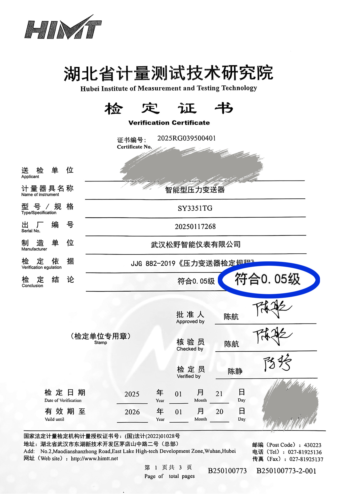 新年伊始,武漢松野智能儀表迎來(lái)技術(shù)新飛躍!我司自主研發(fā)的智能型壓力變送器,精度(準(zhǔn)確度)可以達(dá)到0.05級(jí)(0.05%FS),并經(jīng)過(guò)湖北省計(jì)量測(cè)試研究院的嚴(yán)格測(cè)試,且測(cè)量回差等級(jí)遠(yuǎn)超此標(biāo)準(zhǔn),這是繼0.1級(jí)高精度壓力變送器之后的又一次技術(shù)突破!此次成就,是對(duì)我們持續(xù)創(chuàng)新、精益求精的最好證明。在新的一年里,武漢松野將繼續(xù)秉持匠心精神,致力于技術(shù)革新,為客戶提供更優(yōu)質(zhì)的產(chǎn)品與服務(wù),共創(chuàng)輝煌未來(lái)!