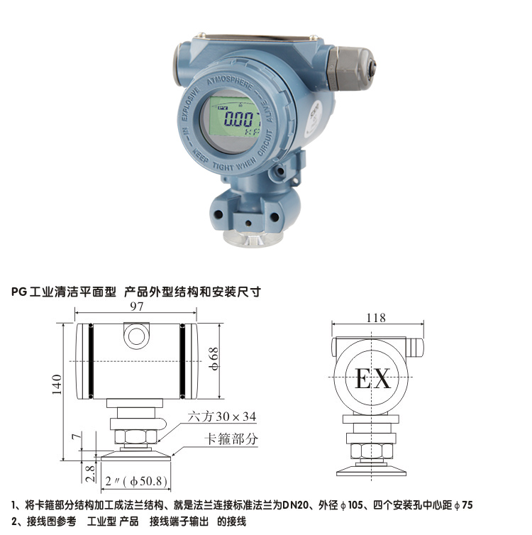 3、確定螺紋接口:常用壓力接口為M20X1.5,如果在特殊場合下使用應(yīng)考慮防爆以及防護(hù)等級。