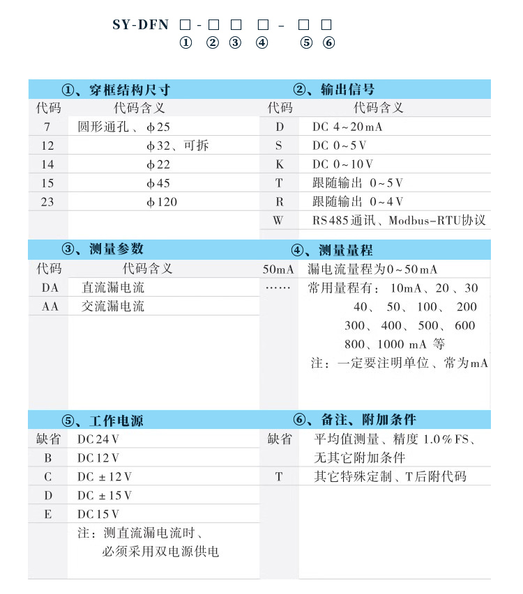 SY-DFN9-DAA200mA、交流漏電流變送器、漏電流量程0~200mA、電源DC24V、輸出DC4~20mA