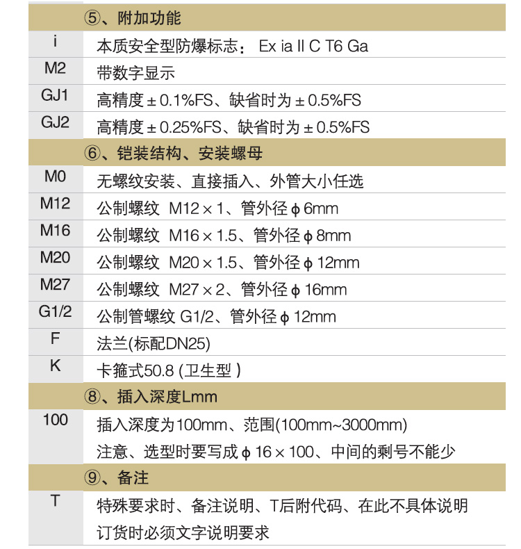 除了選擇前面的參數(shù)外、還必須選擇傳感器安裝要求、安裝螺紋大小、外管大小、外管的插入深度、如上圖選型下半部分